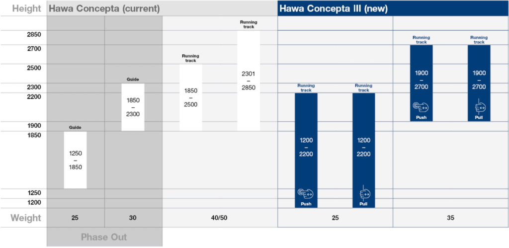 These two options simplify the selection process for most residential and commercial projects. The older version is still available for doors requiring 40kg or 50kg capacities. This gives you a broader range of choices, allowing the Concepta 3 to handle doors of varying sizes and weights.