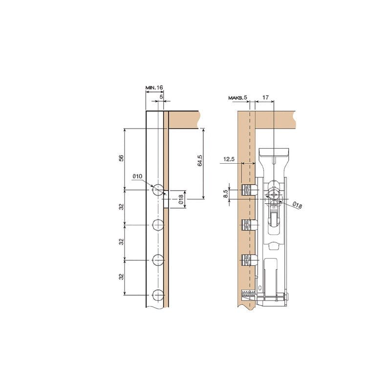 - A Ø18mm hole provides access to all adjustments. Adjustment screws never penetrate the back of the furniture.