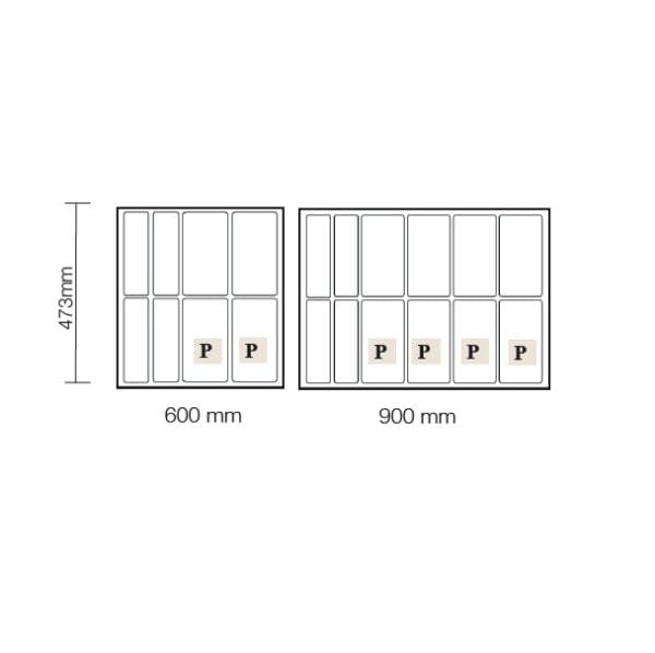 - The selection shows the width of the drawer. Width of the cutlery tray is approximately 100 mm smaller than unit.