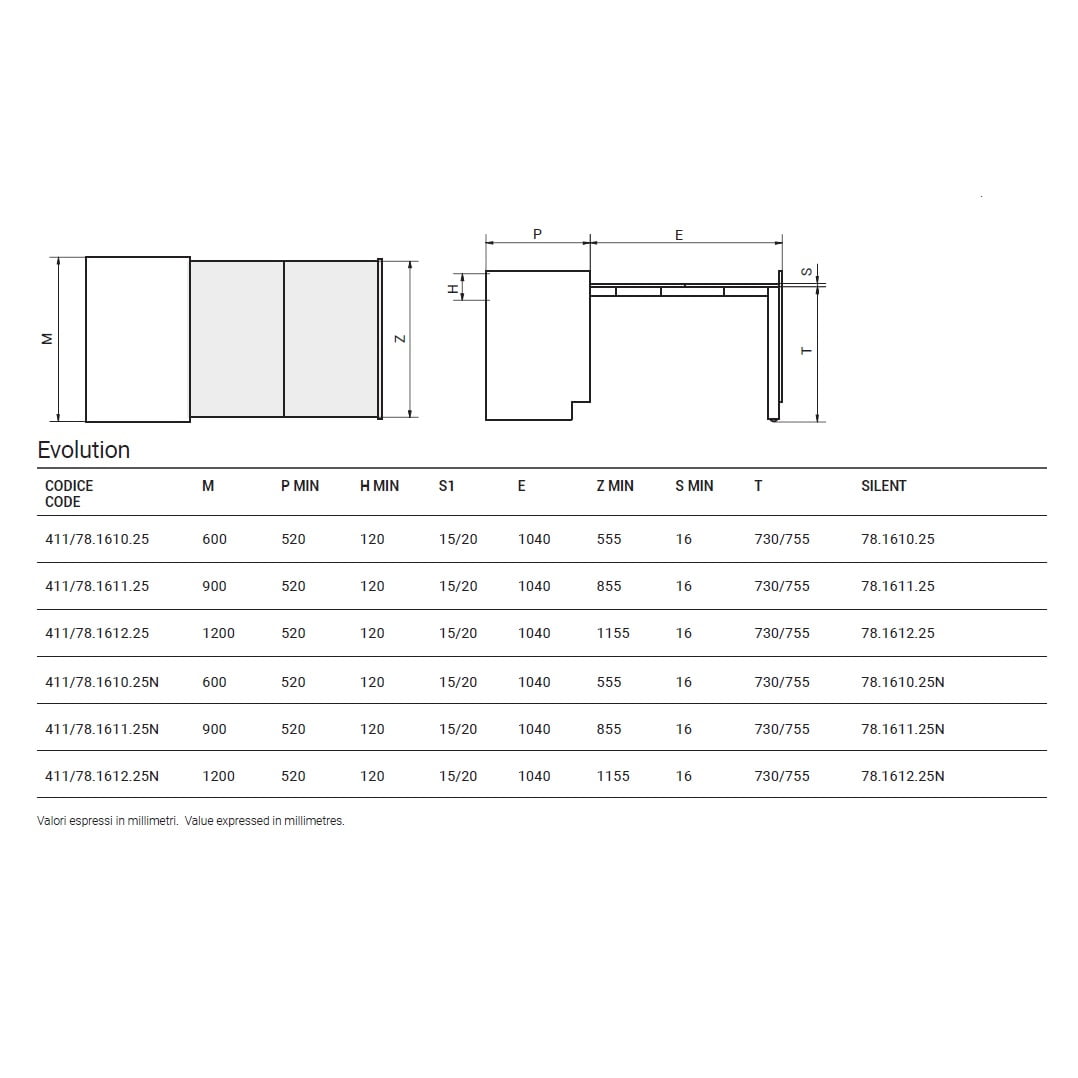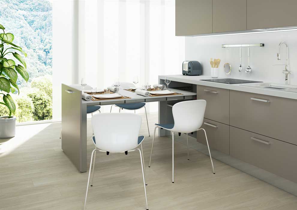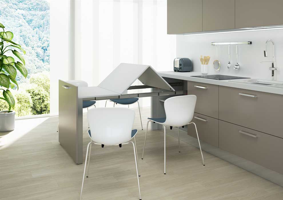 Evolution is a system that allows the instalation of a space-saving medium (100cm) or large (150cm) table inside a cabinet. The mechanism has been designed to allow the use of the door of the furniture composition, or to be inserted in a piece of furniture in which the closing door is not provided (example: monobloc kitchens with retracting doors). The mechanism is supplied complete with painted steel bridge leg with two ground adjustable wheels.