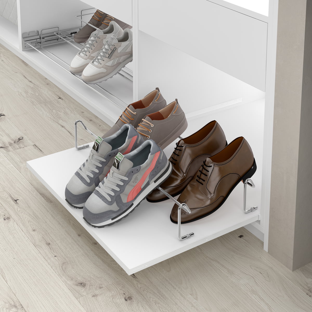 - The dimensions of the Fixed shoe holder for 530mm width wardrobe : 620-960x175x90 mm (width×depth×height).