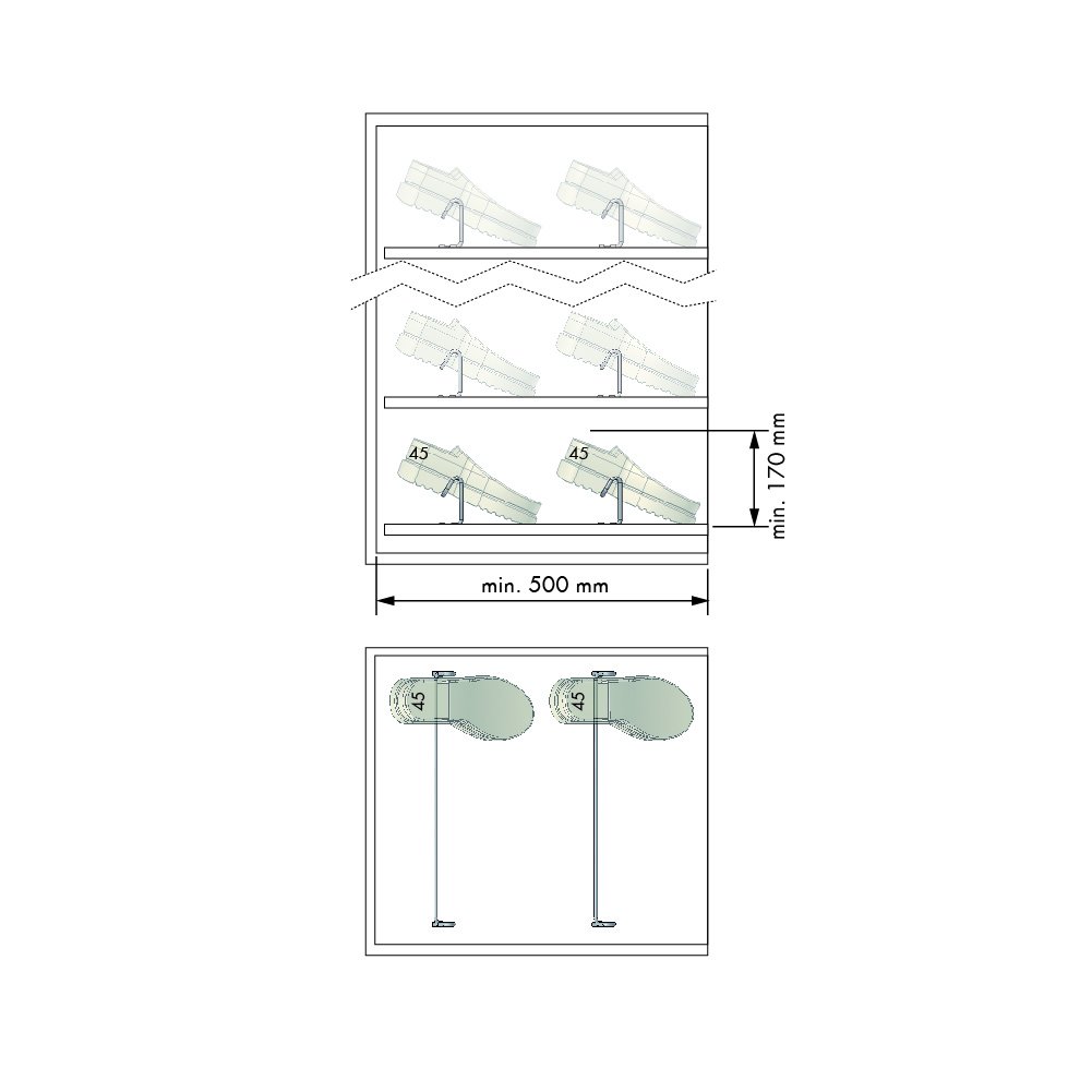 - The dimensions of the Fixed shoe holder for 530 mm width wardrobe : 530x40x100 mm (width×depth×height).