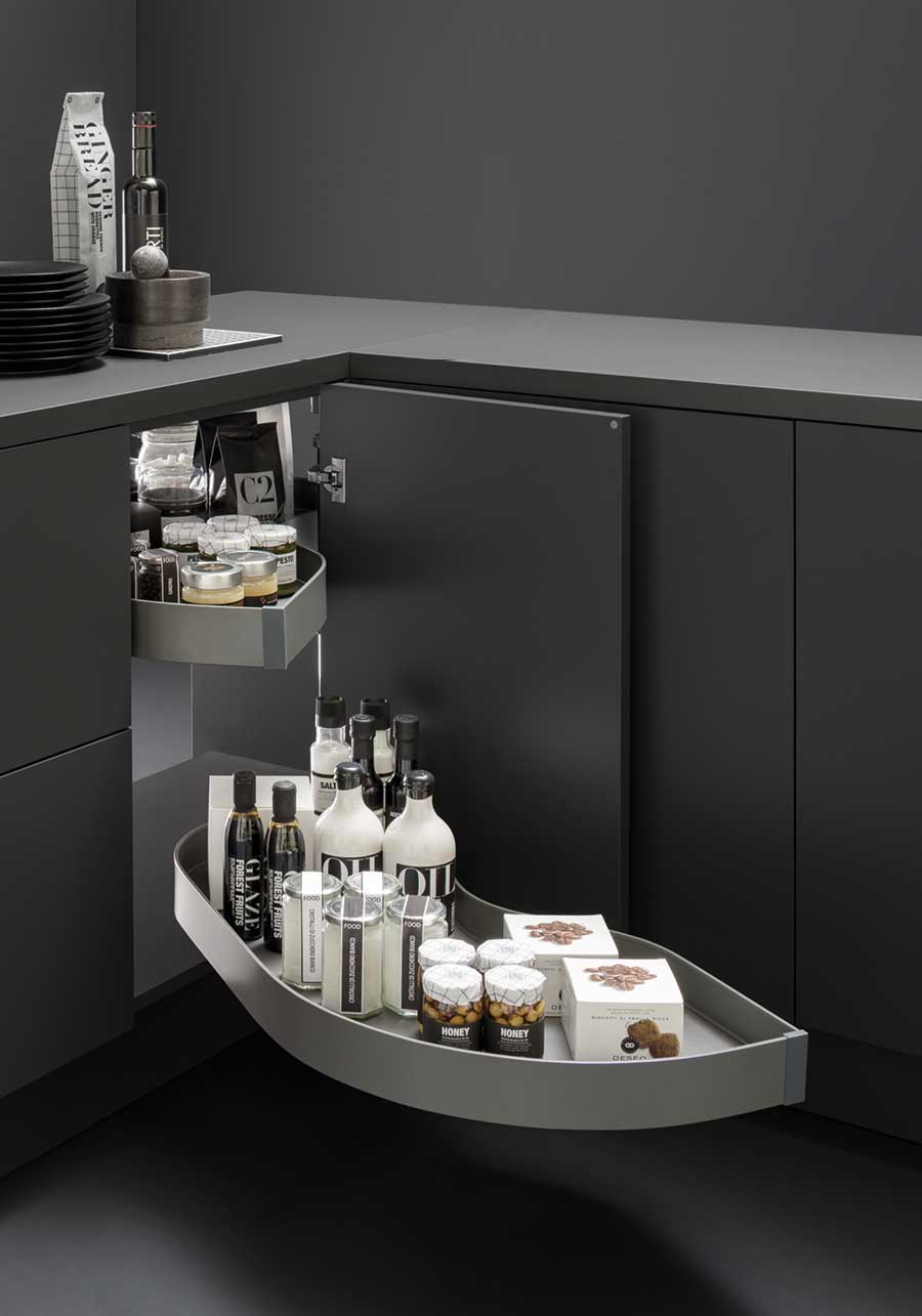 Fly moon with two tiers for corner base 40/45/50 and 60. Reversible product with or without shock absorbed. Shelves are characterized by an aluminum profile with one-piece and base in melamine.