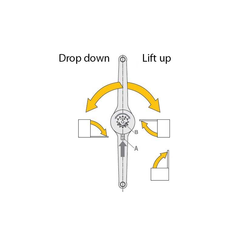 - Simply pressing the actuator (a) permits the upper arm to be passed to one side or the other, changing the braking action from braking when closing to braking when opening. In this way the functioning for lift-up doors and lids is changed to functioning for drop-down doors.