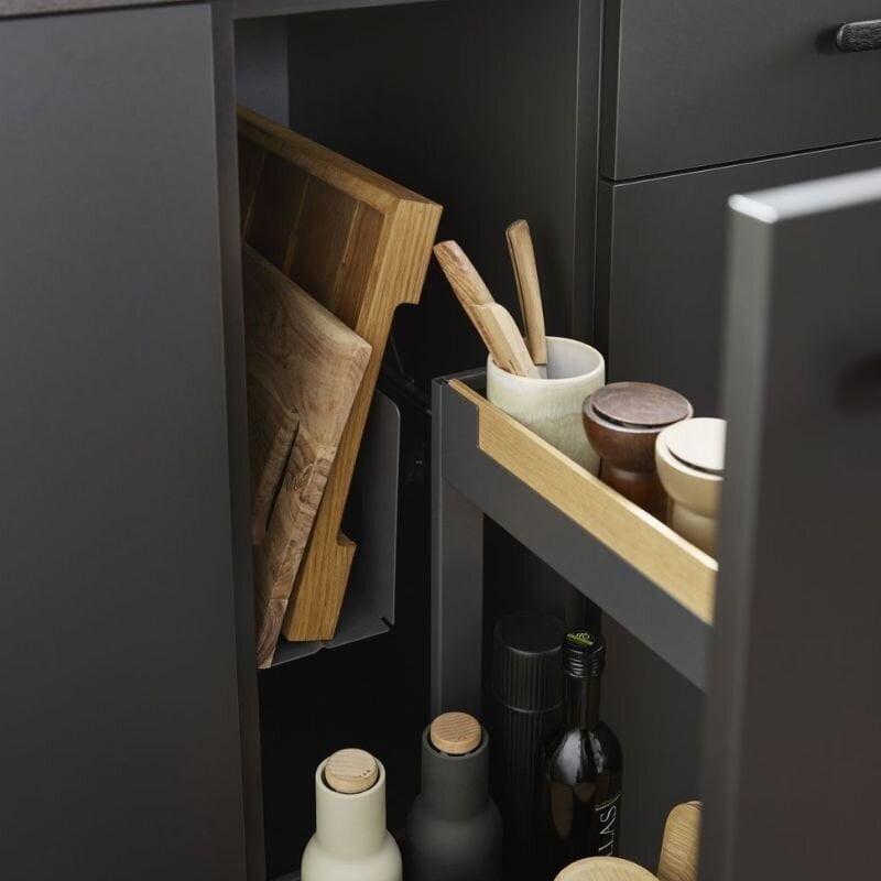 Innovative design solution: the oak inserts ordered separately from us or any other 6 mm thick inserts can be placed on the sides of the shelves, so you can personalize your kitchen design.