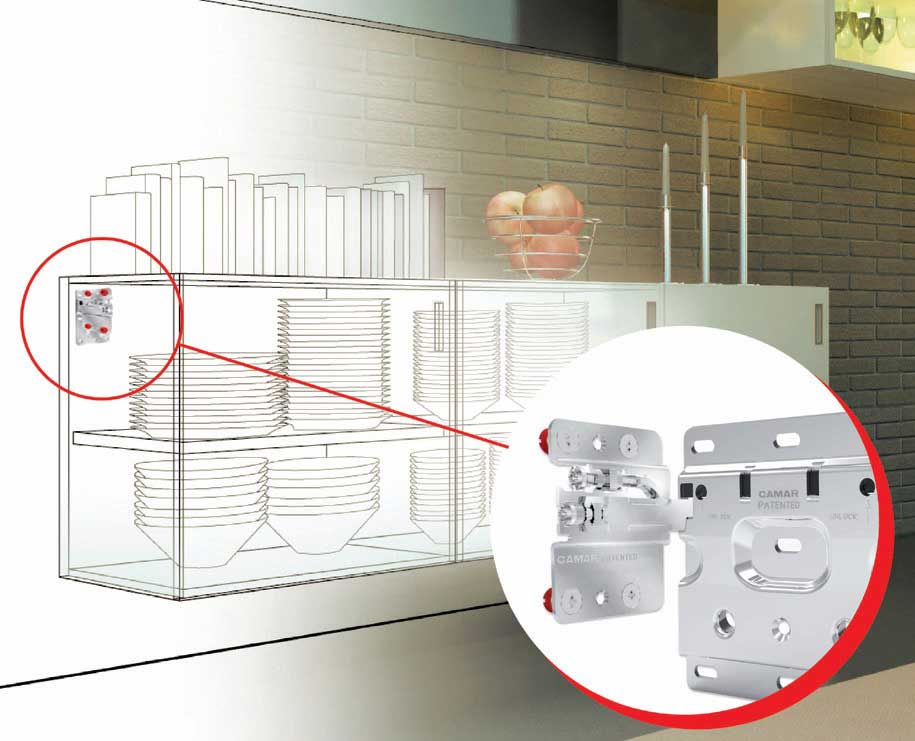 - Integrated “Anti-Drop” system which prevents the cabinet from falling down (detaching from the plate), when it is banged or lifted.