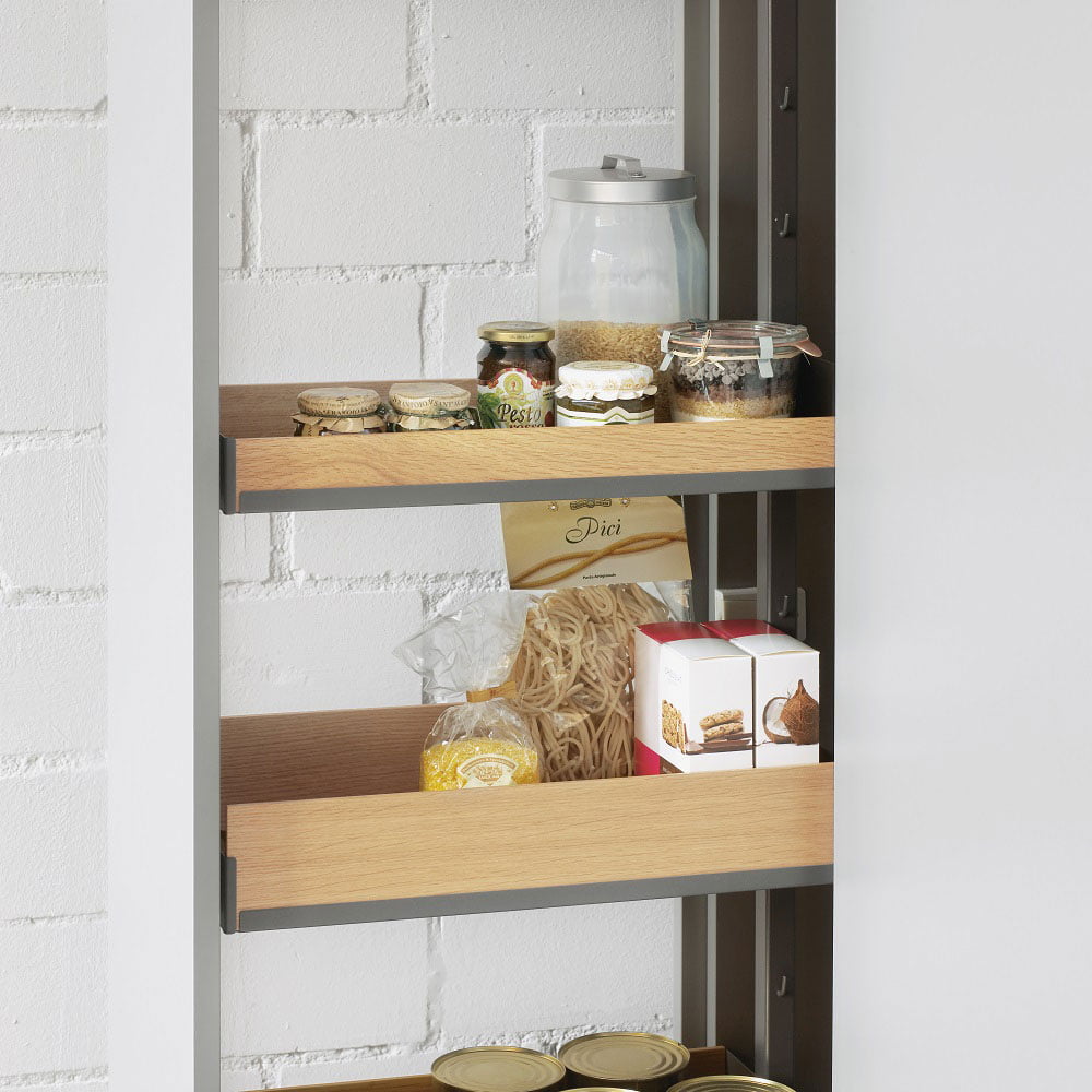 Anthracite colored shelves are equipped with oak side elements, which gives them a distinctive character.